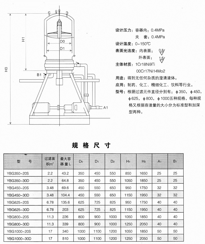 YGB系列葉板式過濾器: 是吸收西歐、日本同類設(shè)備的基礎(chǔ)上自行研制的一種新型高效過濾設(shè)備,可以得到無任何顆粒的澄清液體,廣泛應(yīng)用于制藥、精細(xì)化工、飲料等行業(yè)。該設(shè)備符合國際國內(nèi)制藥行業(yè)GMP要求及美國FDA的要求。 特點(diǎn): 1.過濾體積大,速度快。 2.24層過濾網(wǎng),過濾充分且精度高,可達(dá)到0.2微米。 3.容器外殼設(shè)有夾套,可滿足不同工藝要求的濾液要求 4.過濾材料廣泛,使用后該設(shè)備還有反沖洗操作,使過濾材料在原位置再生無需打開清洗。 5.整個(gè)過濾工藝過程全封閉操作,不會(huì)受到外界污染。 6.適應(yīng)不同品種濾液要求,實(shí)現(xiàn)一機(jī)多用。